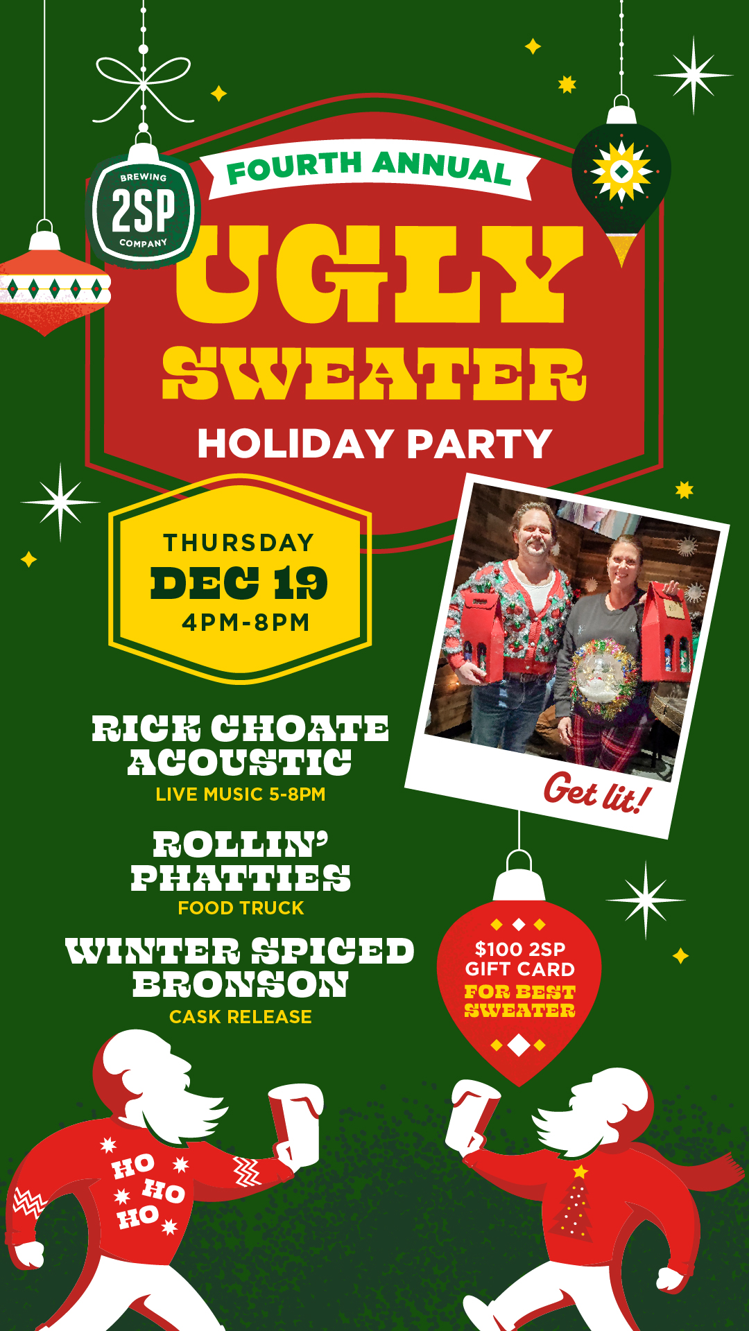 Don we now our ugly apparel! Join us Thursday 12/19 for our forth annual Ugly Sweater party!Sequins?Bows?Homemade?Hand-me-down? Show us what you've got and you could go home with a $100 2SP Brewing gift card- staff's favorite will be chosen at 8:00!Rick Choate Acoustic will be back...