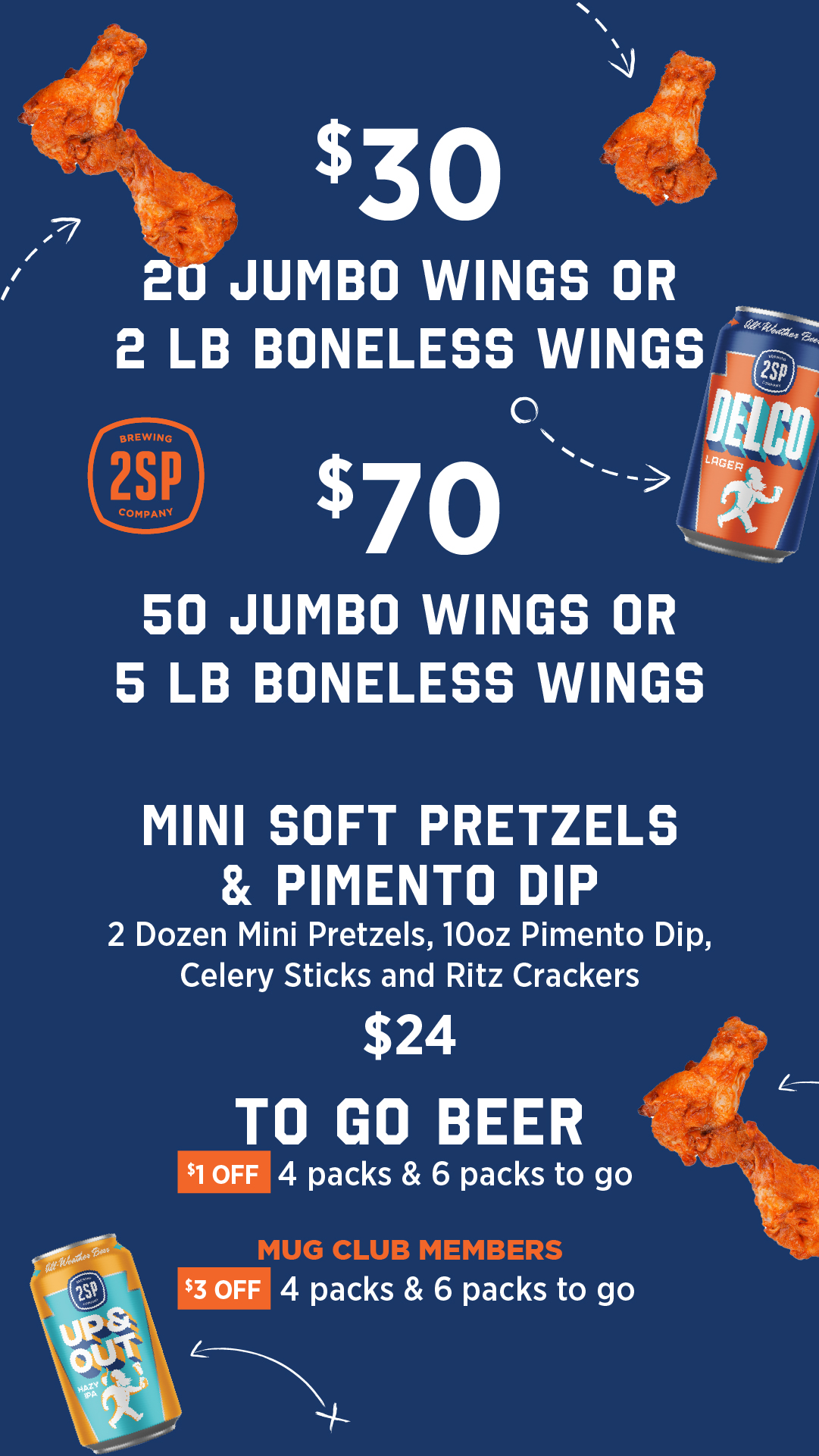Stocking up for the big game? Why not do it all in one place! 20 Jumbo Wings or 2 lbs Boneless Wings - $30 50 Jumbo Wings or 5 lbs Boneless Wings - $70 Mini Soft Pretzels & Pimento Cheese Dip with crackers & celery...
